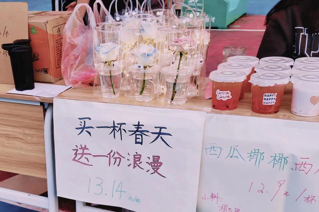 现场人头攒动,热闹非凡,叫卖声、吆喝声和讨价还价声此起彼伏。18个摊位都精心设计了广告牌,所售商品琳琅满目,从汉堡、冰粉、油炸,到杯花、玩偶、日用品应有尽有,前来淘宝的同学都淘在其中,乐在其中。