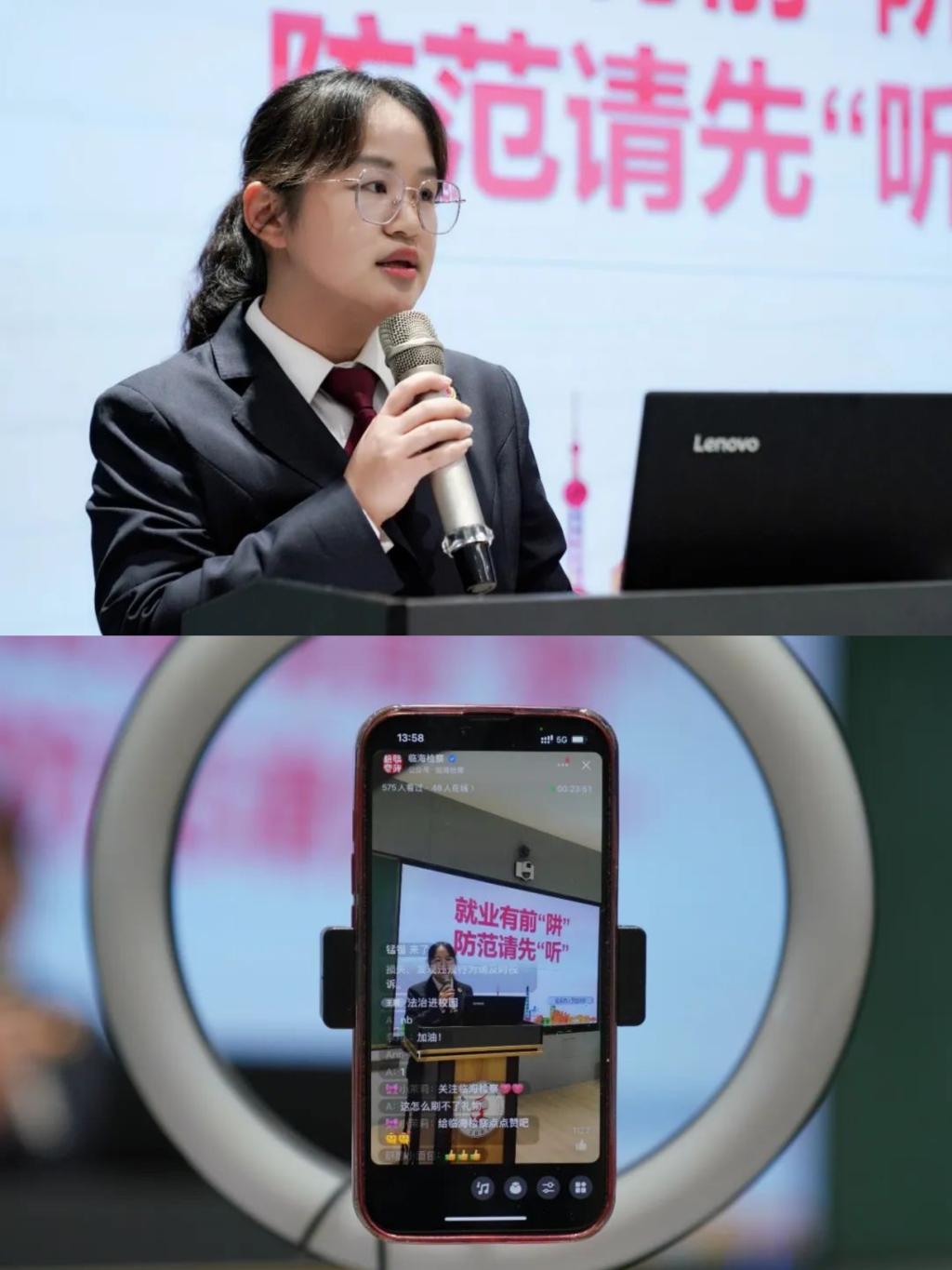 临海市人民检察院第二检察部检察官助理王婷婷以“就业有前‘阱’,防范请先‘听’”为主题,针对就业过程中可能遭遇的风险,从身边典型网络诈骗案例出发,以案释法,用平实易懂、生动风趣的语言为在场学生讲解诈骗罪,帮助信息网络犯罪活动罪,掩饰、隐瞒犯罪所得罪等多种罪名,并提出防范建议。“临海检察”微信视频号对讲座进行了同步直播。