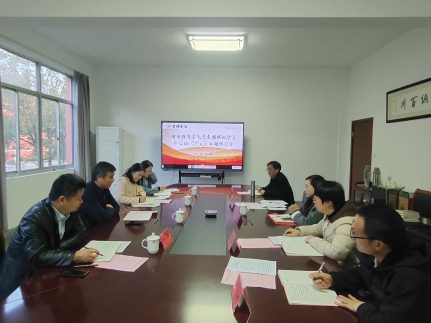 11月28日下午,继续教育学院党支部举行理论学习中心组(扩大)学习会,校党委委员、宣传部部长蔡海江到会指导,进行理论学习中心组学习巡听旁听。学院领导班子成员、党支部全体党员参加会议。会议由直属党支部书记鲍婷婷主持。