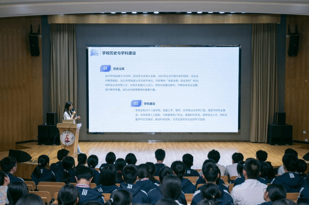 活动伊始,台州学院优秀学生代表向同学们介绍了学校的办学历史、学科建设和校园生活情况,并结合自身经历和同学们交流了学习与生活规划心得,激发高中学子对未来的憧憬与思考。