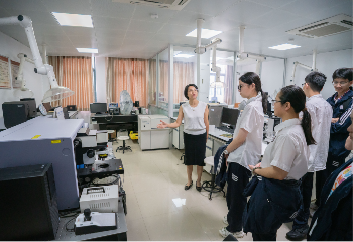 本次研学的核心环节是专业探访与实验室参观。学生们走进生命科学学院、医药化工学院、智能制造学院和商学院,在医药化工学院的分析测试中心参观和了解精密仪器的科研应用场景;在航空大楼的无人机展厅与智能制造实验室中感受“智造”科技的创新力量;在生命科学学院的实验室中操作微量移液器,体验生物实验的严谨与趣味;在商学院的小微金融展厅中探索经济与科技的融合路径,充分感受大学专业的丰富多彩。