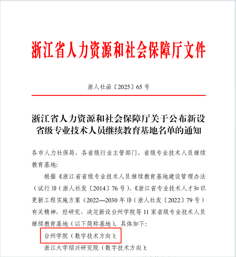 近日,浙江省人力资源和社会保障厅下发《关于公布新设省级专业技术人员继续教育基地名单的通知》(浙人社函〔2025〕65号)文件,我校正式成为浙江省省级专业技术人员继续教育基地,重点方向为数字技术。这标志着我校在继续教育领域省级平台上取得了突破,为学校服务区域高层次专业技术人才培养、助力“数字台州”建设打下了坚实的基础。学校将以此为契机,聚焦台州未来产业,进一步整合资源、优化机制,发挥综合型高校学科专业的资源优势,努力将基地建设成为校地融合、产教融合、特色鲜明的专业技术人员继续教育基地,成为区域各领域各层次专业技术人才知识更新的“加油站”、能力提升的“助推器”和产业发展的“智力源”。