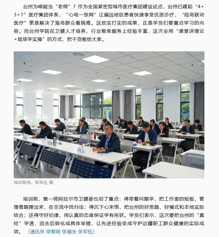 10月27日,第一师阿拉尔市卫健系统选派的20名党员干部齐聚我校,开展为期一周的能力提升培训。新疆生产建设兵团第一师阿拉尔市卫健系统发布专题报道,详细记录了其选派干部在我校圆满完成培训的历程与收获。报道中对我校的培训组织与服务工作给予高度赞誉,这既是一份跨越千里的信任,也是对我校社会服务能力的充分肯定。