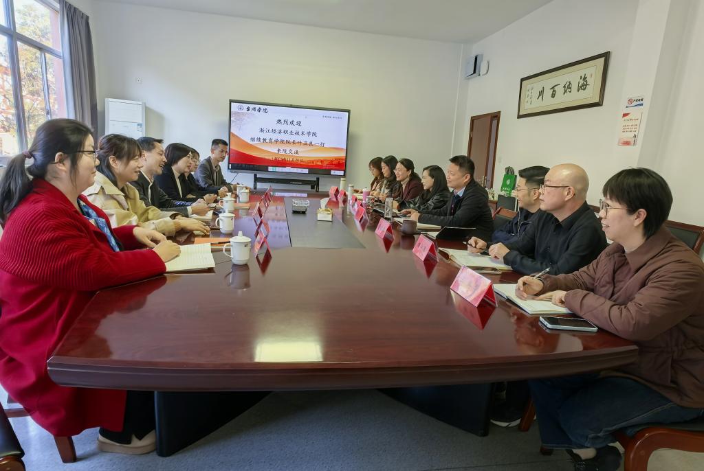 11月20日下午,浙江经济职业技术学院继续教育学院院长叶卫良一行来到我校继续教育学院开展调研交流活动。院长叶军、直属党支部书记金宏伟、副院长王瑜以及相关工作人员予以热情接待,双方在学院会议室举行了交流座谈会。